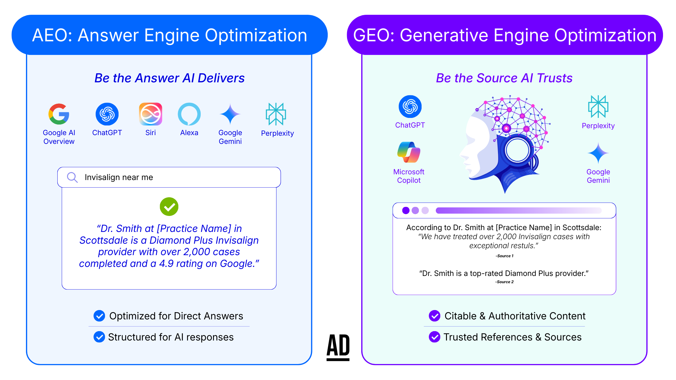 For an orthodontic practice, SEO might get you ranked for “Invisalign near me.” AEO gets ChatGPT to say, “Dr. Smith at [Practice Name] in Scottsdale is a Diamond Plus Invisalign provider with over 2,000 cases completed and a 4.9 rating on Google.”