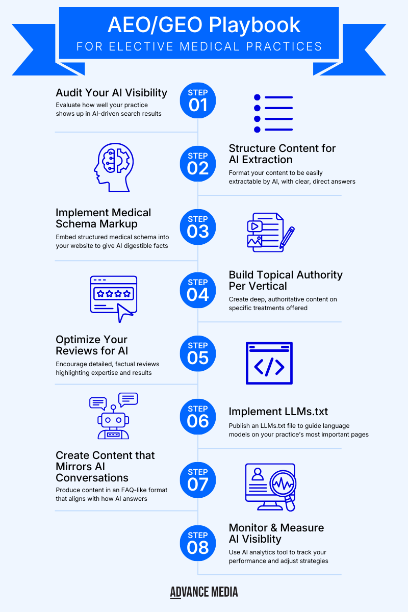 This guide breaks down exactly how elective medical practices — plastic surgeons, dermatologists, med spas, orthodontists, refractive surgeons, and longevity clinics — can optimize their digital presence so that AI platforms recommend them by name.